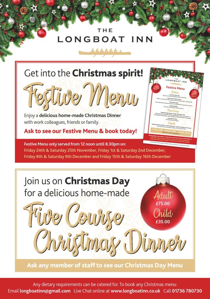 Christmas 2023 Sep 26, 2023 Get into the Christmas spirit with The Longboat Inn. Book your Christmas party with festive menu. Full details below